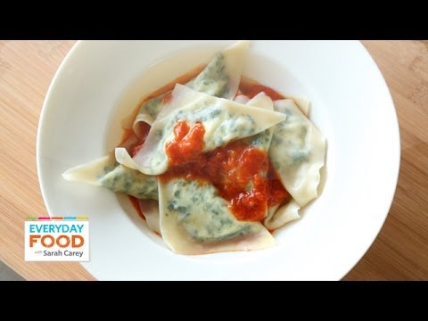 Kale and Ricotta Ravioli - Everyday Food with Sarah Carey - Kale Ravioli Recipe - I'm a big kale fan, and today I'm using this wonder vegetable to create super-simple homemade ravioli. My secret is to use premade wonton wrappers as the ...